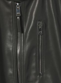 Slim fit faux leather biker jacket with mandarin collar. Zipped welt pockets on chest and hips. Front zip fastening. The size in the photo is a L. Model height: 186 cm.