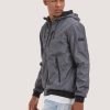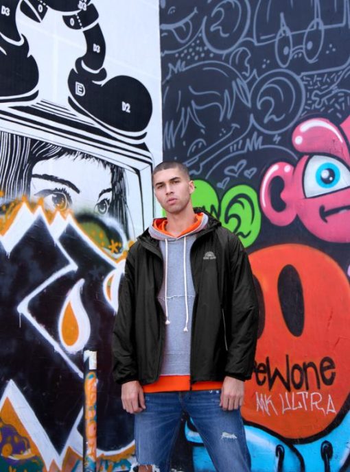 Lightweight windproof jacket with hood, plain colour with contrasting print. The size in the photo is L. Model height: 186 cm.