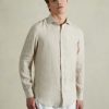 Linen blend short-sleeved shirt with breast pocket and bowling collar. The size in photo is an L. Model height: 185 cm.