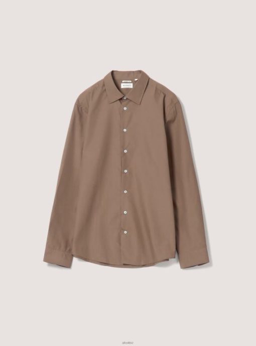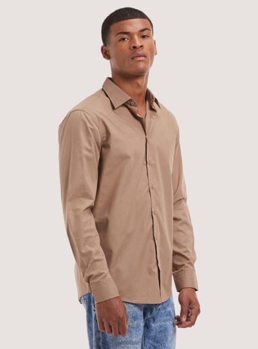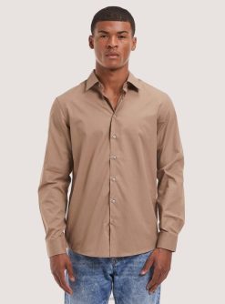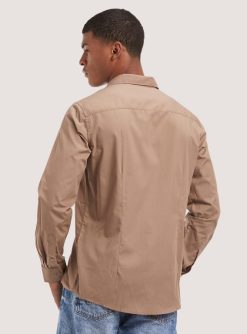 Plain-coloured shirt with lapel collar and long sleeves with cuff and button. Front button fastening. The size in photo is L. Model height: 186 cm