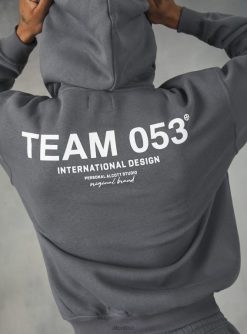 Hooded sweatshirt with front kangaroo pocket, plain with rib bottom hem and cuffs, Team 053 print. Matching trousers available. Fit: comfort fit. The size in photo is a L. Model height: 188 cm.