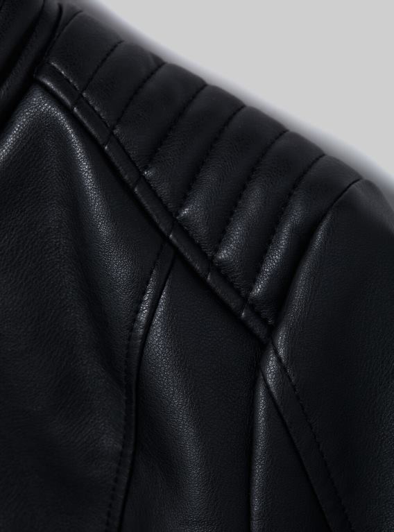 Leather-effect slim fit jacket with mandarin collar. Front pockets with zip. The size in the photo is a: S. Model height: 176 cm.