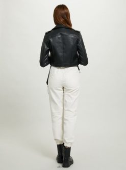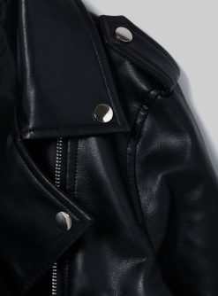Leather-effect biker jacket with lapel collar and long sleeves. Front pockets with metal zip. Shoulder loops detail. Belt application in the same fabric with buckle. Front fastening with metal zip. The size in photo is a S. Model height: 176 cm.