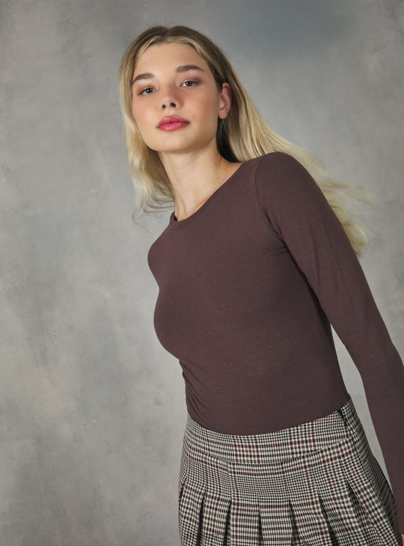 Basic round-neck bodysuit with long sleeves, stretch in solid colour. The size in the photo is S. Model height: 176 cm.